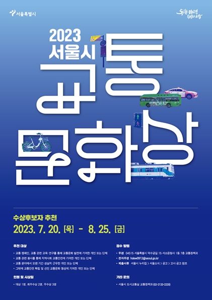 [제주교통복지신문 김강석 기자] 서울시는 이동이 편리하고 안전한 도시, 교통문화를 선도하는 도시를 구현하고자 7월 20일부터 8월 25일까지'2023년 서울특별시 교통문화상'수상후보자를 추천받는다.