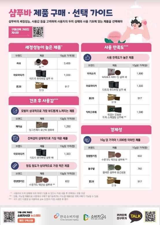 이에 한국소비자원이 소비자 선호도가 높은 샴푸바 10개 제품을 시험․평가한 결과, 제품에 따라 세정성능에 차이가 있고 제품 간 가격 차이는 10g당 최대 5.4배까지 나는 것으로 나타났다. 사용 만족도는 평균 5.5점(9점 척도)이고 제품 간 차이가 미미했으며, 풍부한 거품 발생과 헹굼이 쉬운 정도, 사용 후 적은 잔여감 등은 전반적으로 높게 평가됐다. 또한 전 제품이 종이, 생분해성 수지 등 환경친화적인 포장재를 사용했다.