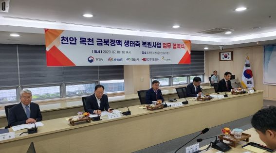 도는 18일 천안시청에서 안재수 도 기후환경국장과 김종률 환경부 자연보전국장, 신동헌 천안시부시장, 박건태 한국도로공사 본부장, 조도순 국립생태원장이 ‘천안 목천 생태축 복원 업무협약’을 체결했다고 밝혔다.