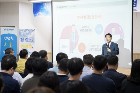 이 날 교육은 이지문 국민권익위원회 청렴연수원 강사를 초빙해 이해충돌방지법과 공무원 행동강령 등 여러 사례 중심의 내용으로 진행됐으며, 공직자가 청렴을 더 쉽고 친근하게 이해하고 실천할 수 있도록 영상프로그램으로 진행하여 갑질에 대한 인식전환의 계기를 마련했다.