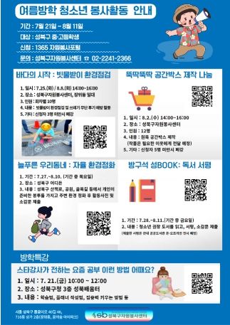 [제주교통복지신문 김강석 기자] 서울 성북구가 오는 8월 11일까지 여름방학을 맞은 청소년을 대상으로 여름방학 프로그램(봉사활동 및 방학 특강)을 운영한다.