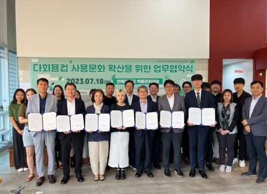 도는 18일 전북대학교에서 전북대학교 총학생회, 커피전문점 대표, 사회적기업이 참여한 가운데 다회용컵 사용문화 확산을 위한 민관 동행 협약을 체결했다고 밝혔다.