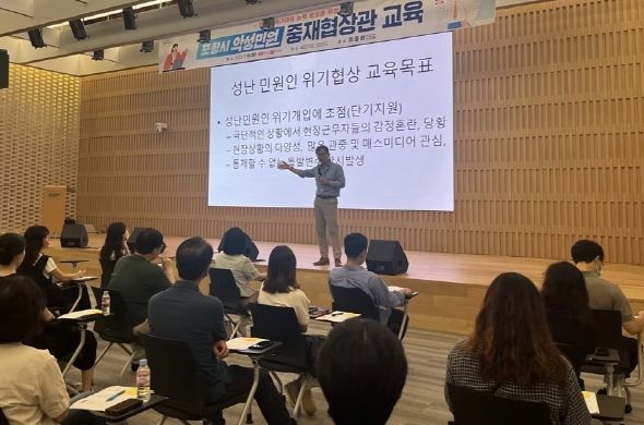 이날 교육은 민원상황을 직접 마주하는 민원실, 인허가 업무 담당 직원 등을 대상으로 위기협상의 개념 이해, 적극적인 청취 및 위기 개입 이론 습득, 상황극의 순서로 진행됐다.