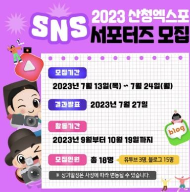 [제주교통복지신문 김강석 기자] (재)산청세계전통의약항노화엑스포조직위원회는 산청엑스포의 소식과 개최 정보를 SNS(누리소통망서비스)를 통해 홍보하는 2023산청세계전통의약항노화엑스포 사회관계망서비스(SNS) 서포터즈를 내달 24일까지 모집한다고 밝혔다.