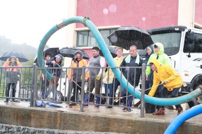 오 군수는 배수펌프장 작동상태, 전기시설 및 유수지 정비 상태 등 시설물 전반에 대해 점검을 시행하고, 현장 내 이동식 양수기 4대를 설치해 즉각적으로 배수 작업에 나서도록 응급조치를 지시해 완료했다.