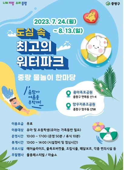 [제주교통복지신문 김강석 기자] 중랑구가 오는 24일부터 8월 13일까지 3주간 ‘중랑물놀이 한마당’을 운영한다.