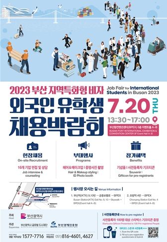 [제주교통복지신문 김강석 기자] 부산시는 지역기업의 인력난 해소와 외국인 유학생 일자리 제공을 통한 지역 정착을 위해 내일(20일) 오후 1시 30분 부산항국제전시컨벤션센터(BPEX)에서 ‘외국인 유학생 채용박람회’를 개최한다고 밝혔다.