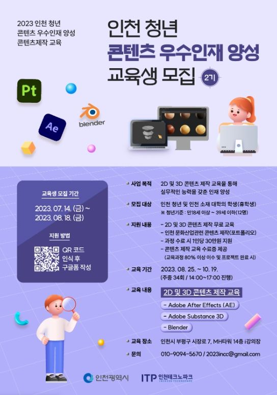 인천 콘텐츠 기업에 필요한 우수 인재를 확보하기 위해 인천 청년을 대상으로 콘텐츠 제작 교육을 무료로 지원하는 사업이다.