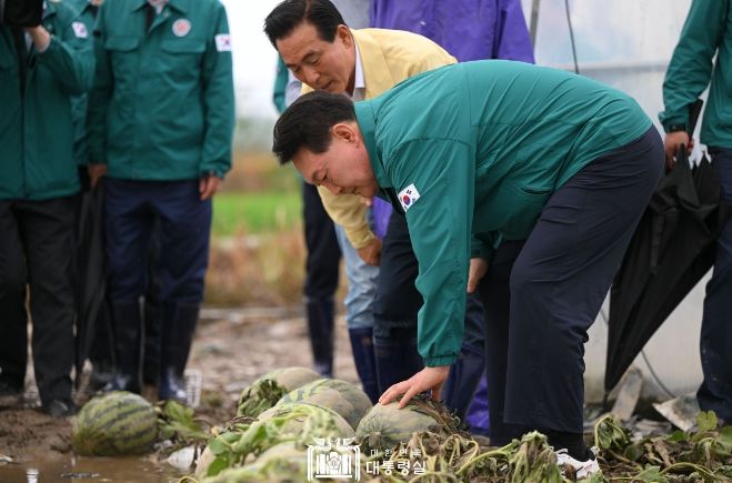 대통령이 비닐하우스에 들어가 직접 물에 잠긴 수박을 만져보며 "이걸 수확할 수 있느냐"고 묻자, 백 시장은 “어려울 것 같다”고 답했고, 김태흠 충남지사는 "이 지역 수박농가의 80퍼센트 정도는 보험에 들었지만 보험에 가입하지 않은 나머지 농가들은 시름이 크다"며 안타까움을 표했다.
