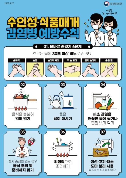 수인성·식품매개감염병 예방을 위해서는 ▲흐르는 물에 30초 이상 비누로 손 씻기 ▲음식 충분히 익혀먹기 ▲조리한 음식은 오래 보관하지 않기 ▲음용수는 끓여서 섭취하기 ▲사용한 칼과 도마는 반드시 소독·세척하기 ▲설사 증상이 있거나 손에 상처가 있는 경우 조리하지 않기 ▲채소·과일은 깨끗한 물에 씻어 껍질 벗겨먹기 등 예방수칙을 준수해야 한다.