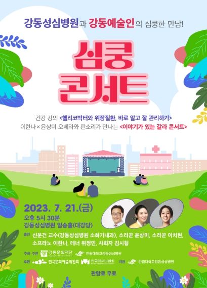 이번 ‘심쿵 콘서트’는 강동성심병원 소화기내과 신운건 교수가 '헬리코박터와 위장질환, 바로 알고 관리하기'라는 주제로 진행해 위장질환의 증상과 치료, 예방에 관한 내용을 딱딱한 강의 형식이 아닌 토크 콘서트로 유쾌하게 풀어낼 예정이다. 또, 지역 예술인 이한나와 윤상미의 오페라와 판소리를 접목한 ‘이야기가 있는 갈라 콘서트’ 공연도 함께 선보일 예정이다.