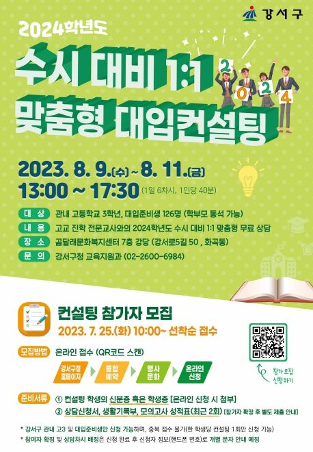 [제주교통복지신문 김강석 기자] 서울 강서구가 오는 8월 9일부터 11일까지 곰달래문화복지센터 7층 강당에서 ‘2024학년도 수시 대비 1:1 맞춤형 대입컨설팅’을 개최, 최적의 입시전략 수립을 돕는다.