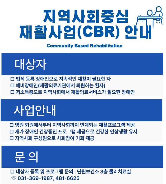 [제주교통복지신문 김강석 기자] 안산시 단원보건소는 지역사회 장애인의 건강한 생활과 재활 인프라 구축을 위해 ‘지역사회중심 재활사업’을 진행한다고 19일 밝혔다.