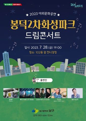 지난 6월 24일 대명역 센트럴 엘리프 아파트를 시작으로 한 ‘2023 문화가 있는 날! 야외 문화공연’이 오는 7월 28일 저녁 7시에 봉덕2차 화성파크드림 아파트에서 개최된다.