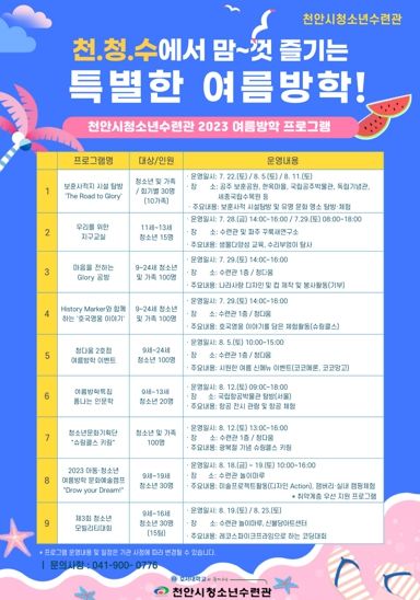 [제주교통복지신문 김강석 기자] 천안시청소년수련관이 여름방학을 맞은 청소년에게 다양한 경험을 제공하고 부모님들의 고민은 덜어주는 여름방학 특별프로그램을 운영한다고 밝혔다.