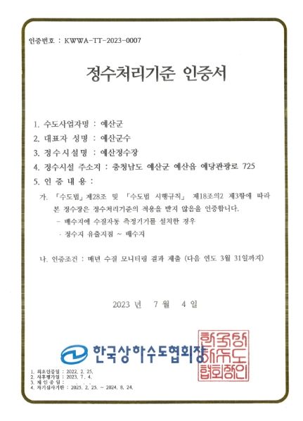 예산정수장은 2022년 2월 25일에 정수처리기준 최초 인증을 받아, 이번 2023년 7월 4일에 정수처리기준 인증서를 획득했다.