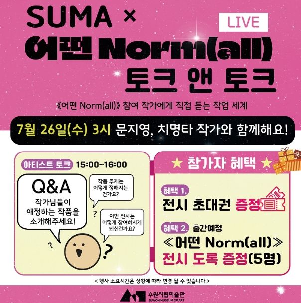 [제주교통복지신문 김강석 기자] 경기도 수원시 수원시립미술관은《어떤 Norm(all)》전시 연계 세 번째 프로그램 '《어떤 Norm(all)》 × 아티스트 토크〉를 7월 26일(수) 오후 3시 수원시립미술관에서 개최한다.