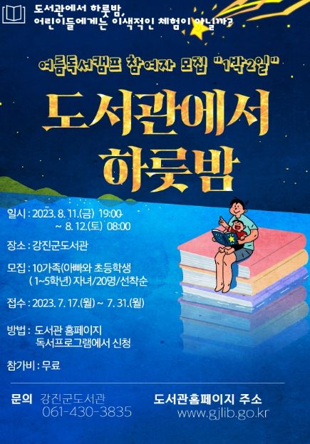 [제주교통복지신문 김강석 기자] 강진군도서관이 초등학생들의 여름방학을 맞이해 아빠와 자녀가 함께 즐기는 ‘도서관에서 하룻밤’ 프로그램을 마련했다고 18일, 밝혔다.