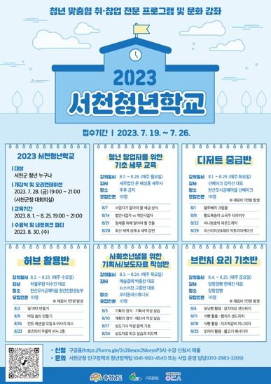 [제주교통복지신문 김강석 기자] 서천군이 청년들의 역량 강화와 취미·문화·생활 등 다양한 활동 기회를 보장하고자 청년학교 프로그램 참여자를 모집한다.