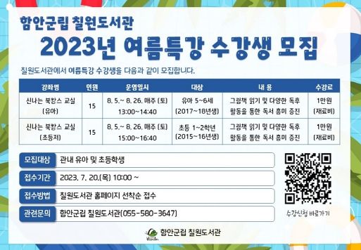 [제주교통복지신문 김강석 기자] 함안군립 칠원도서관은 오는 20일부터 군내 유아 및 초등 저학년을 대상으로 2023년 여름특강 수강생을 모집한다.