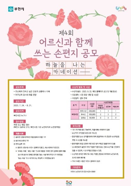 [제주교통복지신문 김강석 기자] 부천시가 오는 7월 24일부터 8월 31일까지 제4회 어르신과 함께 쓰는 손편지 공모전 ‘하늘을 나는 카네이션’을 개최한다.