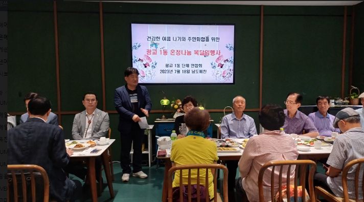 이날 행사에는 광교1동 단체장협의회 위원들은 어르신들과 함께 식사하며 반갑게 이야기를 나누고 더운 여름을 건강하게 보내시기를 바라는 마음을 전하며 즐거운 소통의 시간을 가졌다.