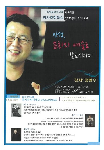 [제주교통복지신문 김강석 기자] MBC‘다모’,‘주몽’, KBS‘징비록’등 흥행 드라마 극본을 집필한 정형수 작가가 20일 순창을 방문하여 강연을 펼친다.