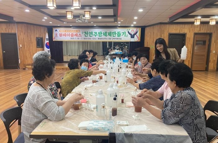 [제주교통복지신문 김강석 기자] 부안군 계화면 주민자치위원회는 공고모집으로 신청 접수한 지역주민 120여명이 참여한 가운데 원데이클래스 ‘천연 주방세제 만들기’ 프로그램이 지난 18일부터 19일까지 양일간 6타임으로 나누어 계화면사무소 2층 다목적회의실에서 진행됐다고 밝혔다.