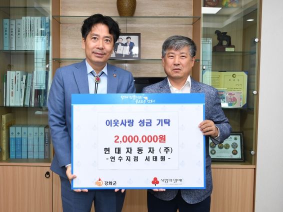 [제주교통복지신문 김강석 기자] 강화군은 19일 현대자동차 연수지점에서 근무하는 서태원 부장이 이웃돕기 성금 200만원을 기탁했다고 밝혔다.