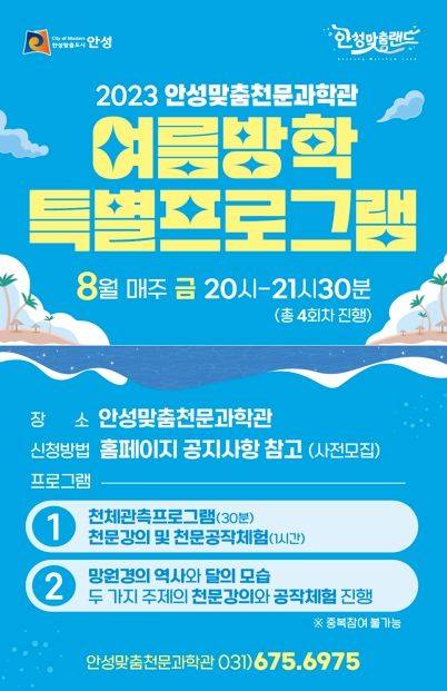 [제주교통복지신문 김강석 기자] 안성시는 여름방학을 맞이하여 안성맞춤랜드 내 천문과학관에서 오는 8월 매주 금요일에 ‘천문과학관 여름방학 특별프로그램’을 개최한다고 밝혔다.