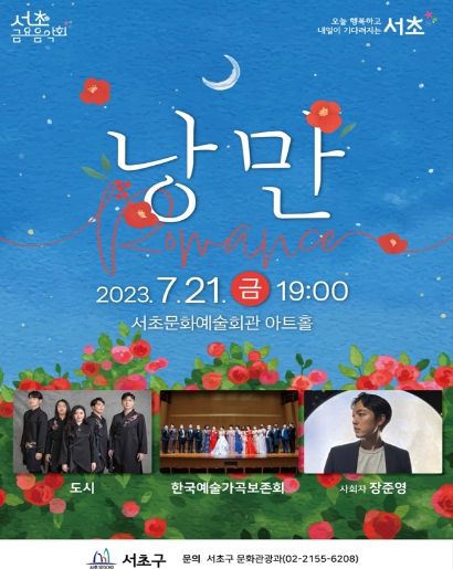 [제주교통복지신문 김강석 기자] 서울 서초구는 오는 21일 19시에 서초금요음악회 7월 공연 '낭만'을 서초 문화예술회관 아트홀에서 연다.