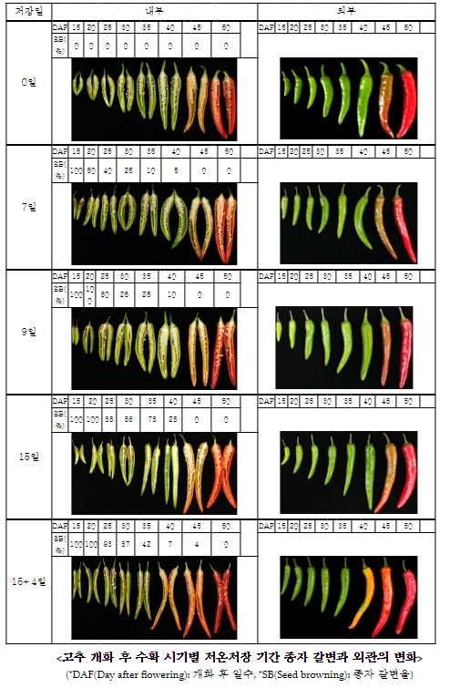 그 결과, 꽃이 피고 15일 뒤 수확한 고추는 7일 안에 씨가 갈색으로 변하는 비율이 100%에 달했지만, 40일 뒤에 수확한 고추는 저온에서 15일간 저장한 뒤에도 씨의 갈변 비율이 28%에 머물렀다.