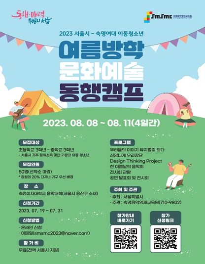 [제주교통복지신문 김강석 기자] 서울시는 여름방학을 맞아 저소득층 가정 자녀의 문화·예술 향유 확대를 위해 서울시 내 대학교와 협력해 중위소득 100% 미만 자녀(초3~고3)를 대상으로 하는 여름방학 문화·예술 동행 캠프를 운영한다.