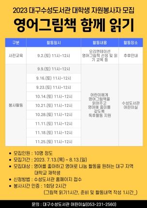 [제주교통복지신문 김강석 기자] 대구수성도서관은 오는 8월 13일까지 도서관을 방문하는 어린이들과 함께 영어그림책을 읽을 ‘2023 영어그림책 함께 읽기’ 대학생 자원봉사단을 모집한다.