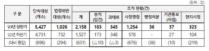 단속결과 위반법령 세부 조치사항은 송치(입건) 163건, 과태료 345건, 시정명령 1,254건, 행정처분 36건, 기관 이첩 통보 37건, 현지시정 323건이다.