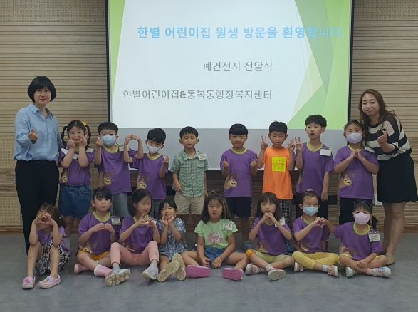 이날 참여한 원생들은 가정과 어린이집에서 나온 폐건전지를 하나하나 모아 300여 개의 폐건전지를 전달했으며, 행정복지센터에서 재활용과 교통안전에 대한 어린이 맞춤형 동영상을 시청하며 실천을 다짐하는 시간을 가졌다.