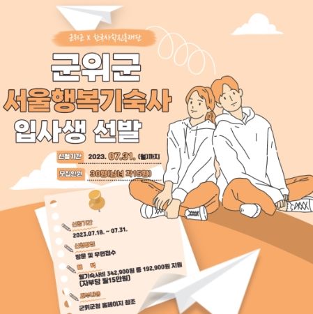 [제주교통복지신문 김강석 기자] (사)군위군교육발전위원회와 한국사학진흥재단은 7월 18일부터 31일까지 14일간 행복기숙사(서울 동소문동)의 입사생 모집을 진행한다고 밝혔다.