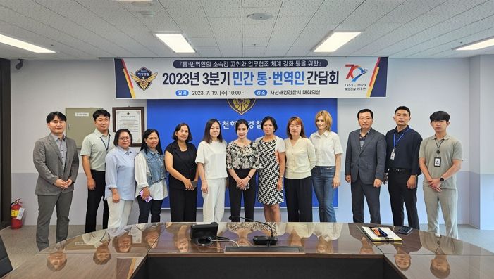 [제주교통복지신문 김강석 기자] 사천해양경찰서는 7월19일 청사 대회의실에서 민간 통·번역인 간담회를 개최했다고 밝혔다. 이 날 행사는 러시아어, 베트남어 등의 민간 통·번역인 8명이 참석했고, 민간 통·번역인들과의 소속감 고취와 업무협조 체계 등을 강화하고자, 간담회를 통한 소통의 시간, 통·번역인의 건의사항 및 애로사항 청취 등으로 진행됐다.