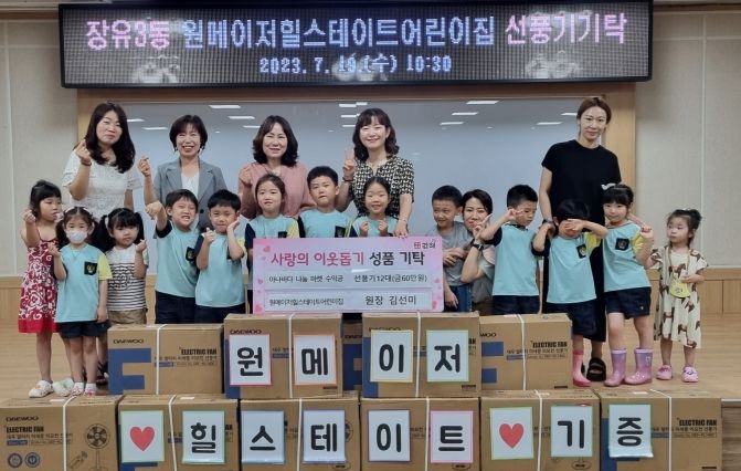 [제주교통복지신문 김강석 기자] 김해시 장유3동 소재 원메이저힐스테이트 어린이집에서 2023. 7. 19일 폭염에 취약한 저소득 가구에 사용해 달라며 선풍기 12대(60만원 상당)를 장유3동행정복지센터에 기탁했다.