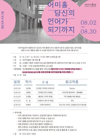 8월 매주 수요일 오후 3시, 대구미술관 개방형 전시 공간인 어미 홀에서 진행하는 이 프로그램은 전시 관람 후 생기는 여러 생각과 질문을 작가와 관람객이 함께 나누며 ‘배움과 채움’의 시간을 마련하기 위해 기획했다.