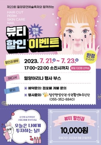 이번 행사는 밀양공연예술축제 연극 관람객을 대상으로 추진하는 이벤트다. 참여를 희망하는 밀양시민 또는 관람객은 21일부터 23일까지 밀양아리나 내 이벤트 부스를 방문하면 되며, 부스 운영시간은 오후 5시부터 10시까지다. 이벤트 기간 내 연극 티켓을 소지한 관람객 1인당 뷰티 1만원 할인권을 교환받을 수 있다.