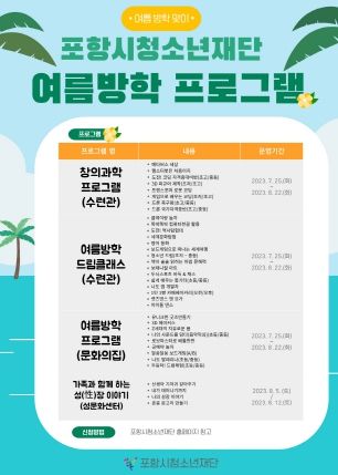 [제주교통복지신문 김강석 기자] 포항시청소년재단은 여름방학을 맞이하는 지역 청소년들을 위해 다양한 프로그램을 마련한다고 19일 밝혔다.