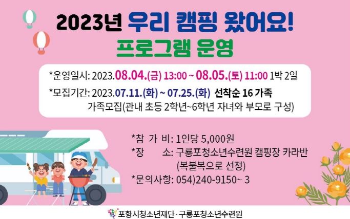 [제주교통복지신문 김강석 기자] 포항시청소년재단 구룡포청소년수련원에서는 내달 4~5일 1박 2일 캠프 프로그램 ‘우리 캠프왔어요’를 운영한다고 밝혔다.