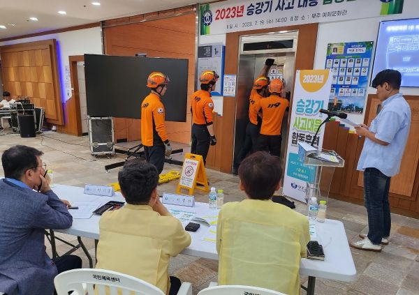 이날 훈련 외에도 무주군은 무주군 홈페이지와 전광판 등을 활용해 “승강기 갇힘 사고 대응요령”을 공유하고 리플릿과 전단지를 배포하는 등 군민 관심을 모으는데 주력하고 있다.