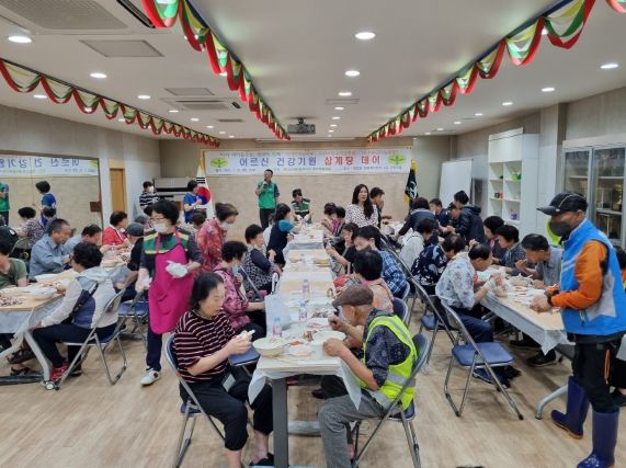 무더위와 장기화된 장마로 어려움을 겪고 있을 관내 어르신 200여 명을 초청해 영양 가득한 삼계탕과 떡, 과일을 대접하고 마스크를 나눠드렸다.