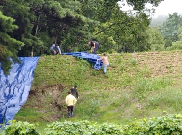 고수면에서도 묵동저수지의 비탈면 유실부문의 긴급복구가 진행됐다. 군청을 비롯해 고수면, 고수면민회 등이 힘을 합쳐 토사가 쓸려 내려간 부분에 80m의 천막을 덮어 응급복구를 완료했다.
