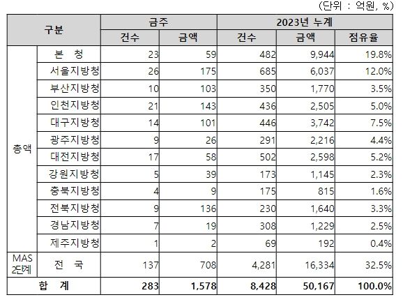 지역별 발주량을 보면, 총액계약 대상 870억 원 중 본청이 59억 원으로 6.8%를 집행하고 서울청 등 11개 지방청에서 811억 원을 각각 집행할 예정이다.