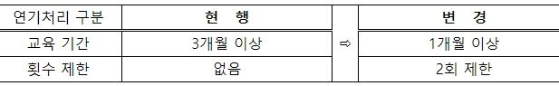 병무청은 그동안 동원훈련 입영대상자가 직업훈련 기관에서 3개월 이상 과정에 재학 중인 경우 입영을 연기해 주던 것을(국비과정은 기간 제한 없음), 10일부터는 1개월 이상 과정에 재학 중인 경우까지 확대하도록 동원훈련 연기제도를 개선했다.