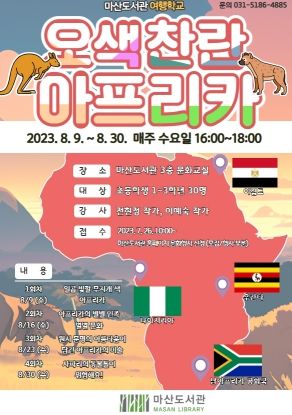 [제주교통복지신문 김강석 기자] 김포시립 마산도서관은 아프리카의 문화와 역사, 동물에 관심 있는 어린이들을 위해 오는 8월 9일부터 30일까지 마산도서관 3층 문화교실에서 총 4회에 걸쳐 마산도서관 여행학교 ‘오색찬란 아프리카’ 프로그램을 운영한다.