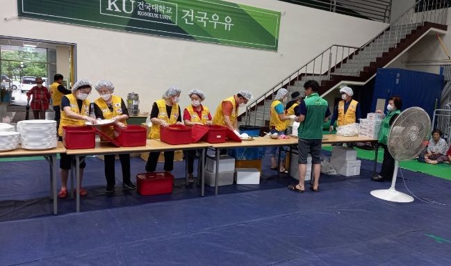 충주지구협의회 회원 50여 명은 지난 15일 집중호우 당시 괴산댐 월류로 발생한 대피 명령에 따라 주민 대피시설인 건국대학교 글로컬캠퍼스로 대피한 시민들을 위해 식사 300인분을 제공했다.
